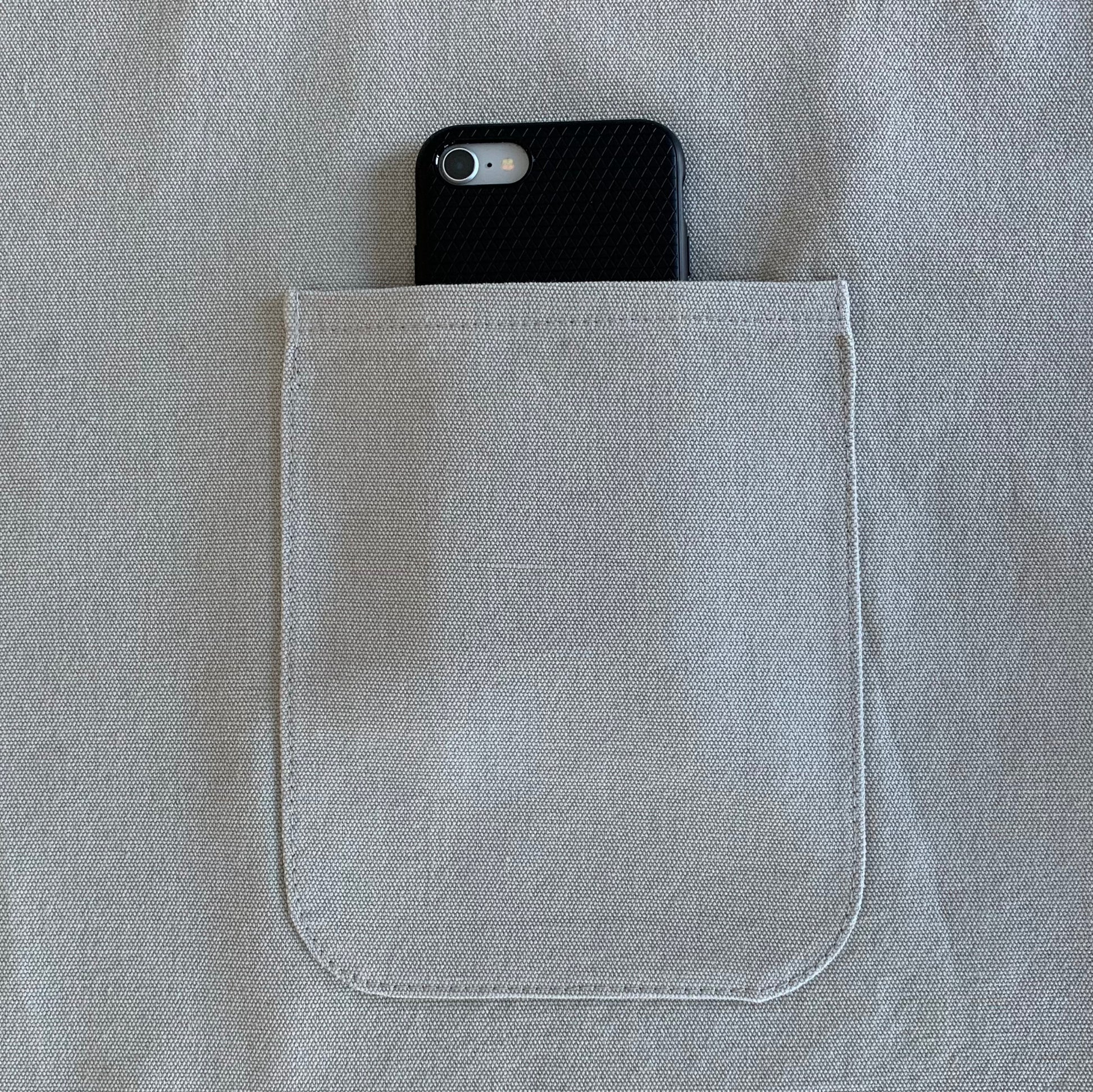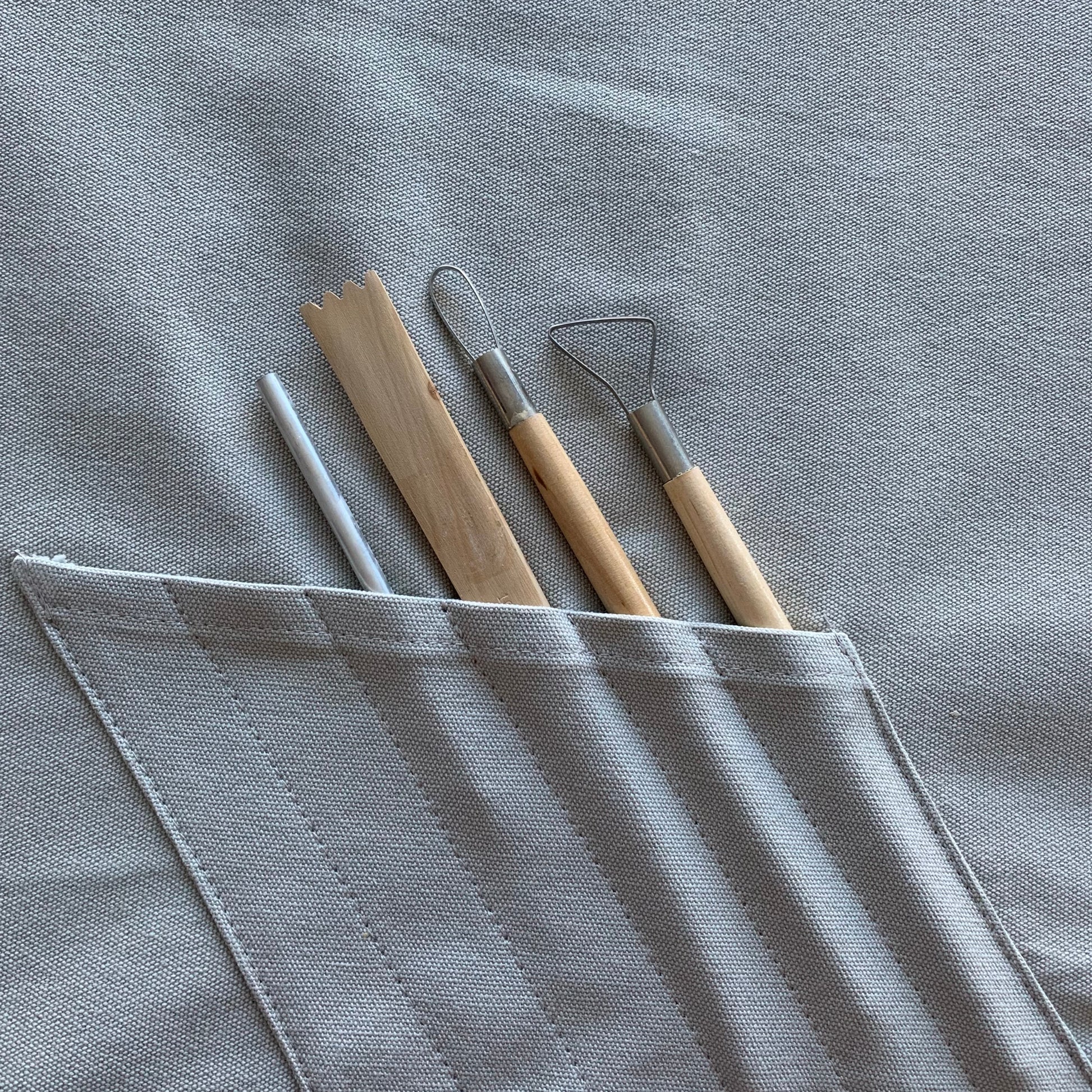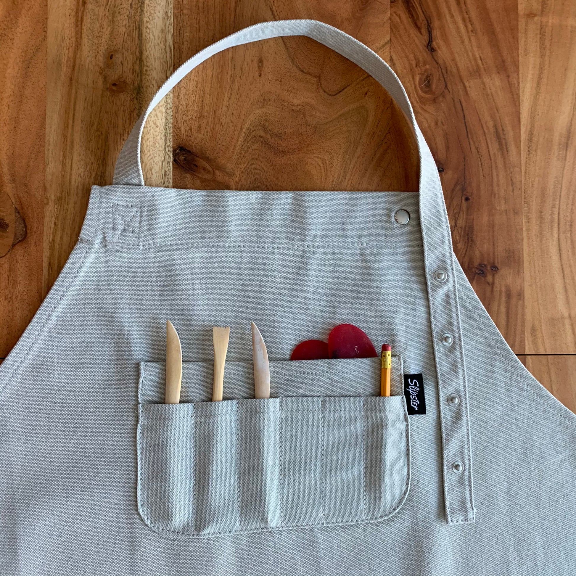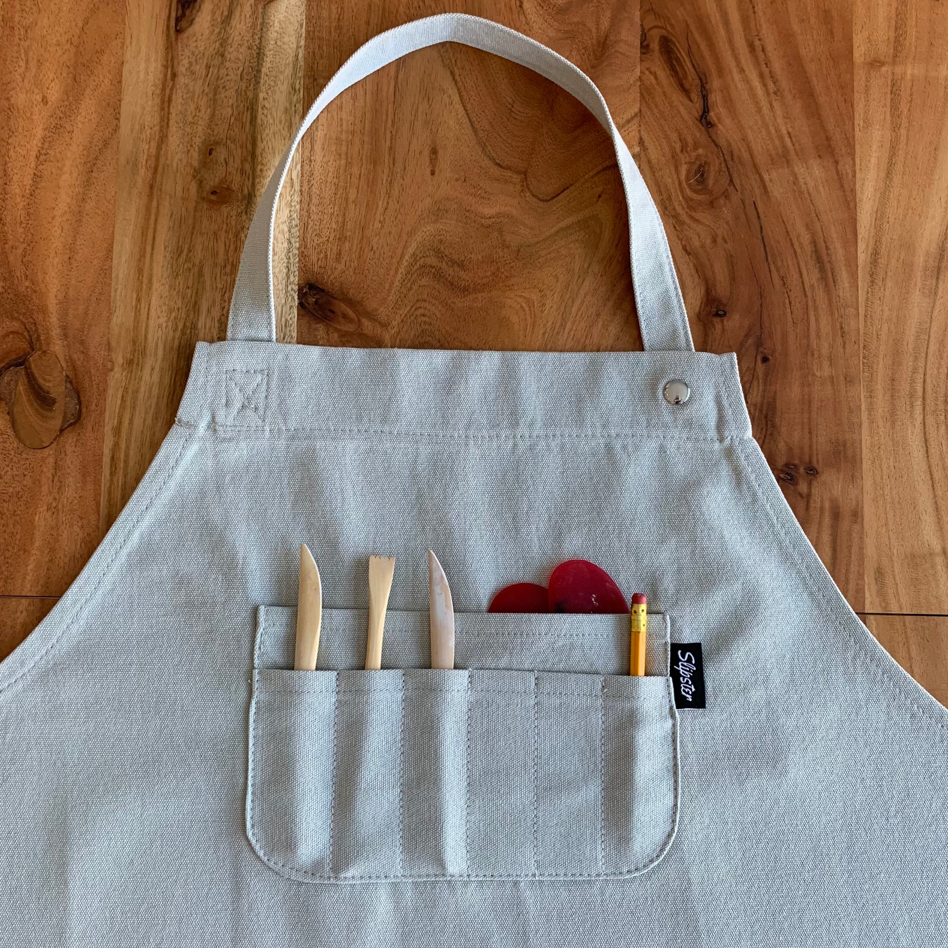 The Slipster Pottery apron features a split leg design to accommodate working on the pottery wheel. Handy pockets are located on the chest and on each leg for convenient access to your clay tools. The light grey canvas material is durable for working with clay.